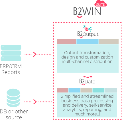B2Win Suite is an innovative platform combining the most needed functionality for businesses to optimize data processing, presentation and distribution of reports and business documents, covering areas of OM/CCM, Query, Reporting, BI and others.