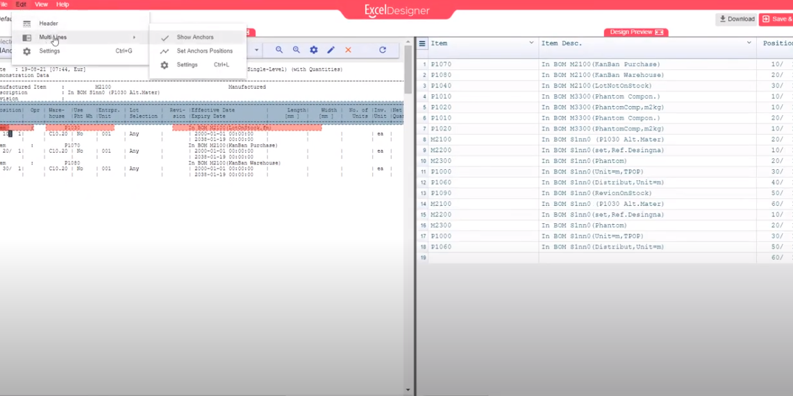 If the ERP report contains multi-line data, it needs to be designed using B2Design before you can convert it to Excel format.